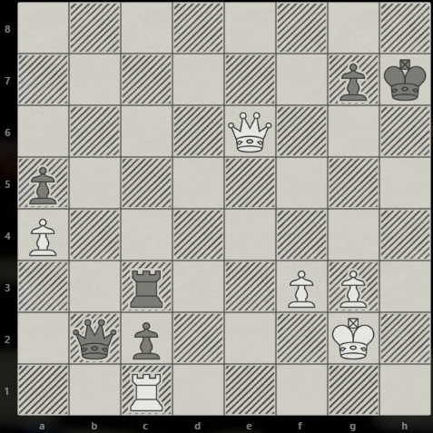 白の手番。白のクイーンがどこに動いても、c7のポーンを守ることができない不思議な陣形です。